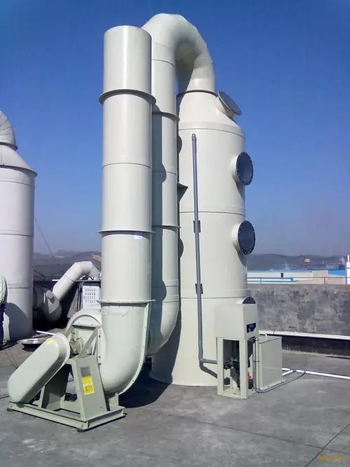 然后進(jìn)入噴淋層,噴淋形式采用雙層填料和兩級(jí)噴淋,使氣液充足接觸,提高了凈化效率。該塔配有玻璃鋼離心風(fēng)機(jī)、塑料水泵或不銹鋼水泵。當(dāng)處理風(fēng)量在10000立方米以上時(shí),兩臺(tái)泵即可滿足要求。